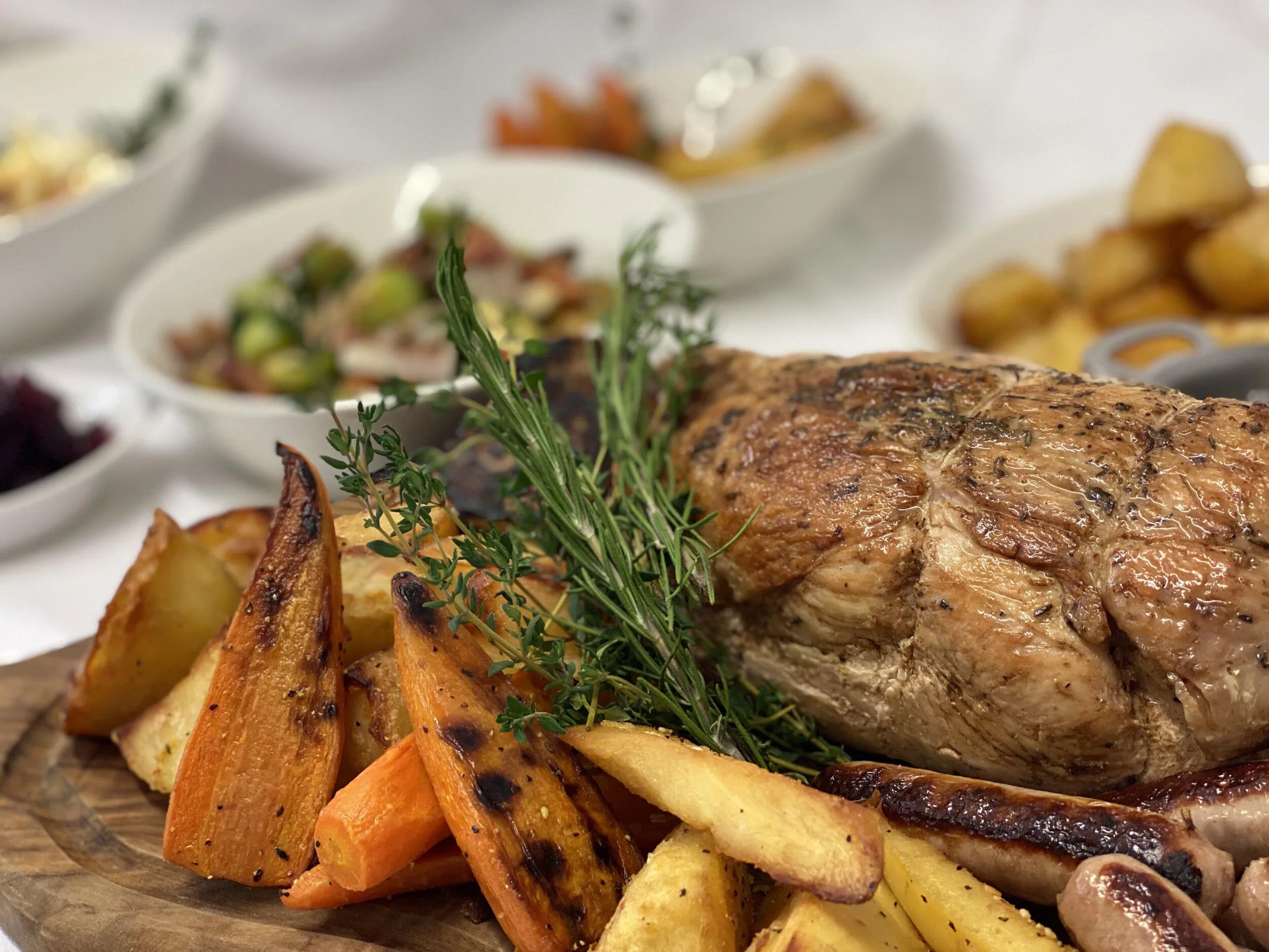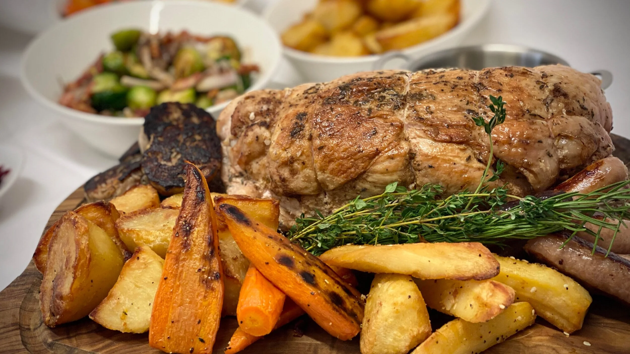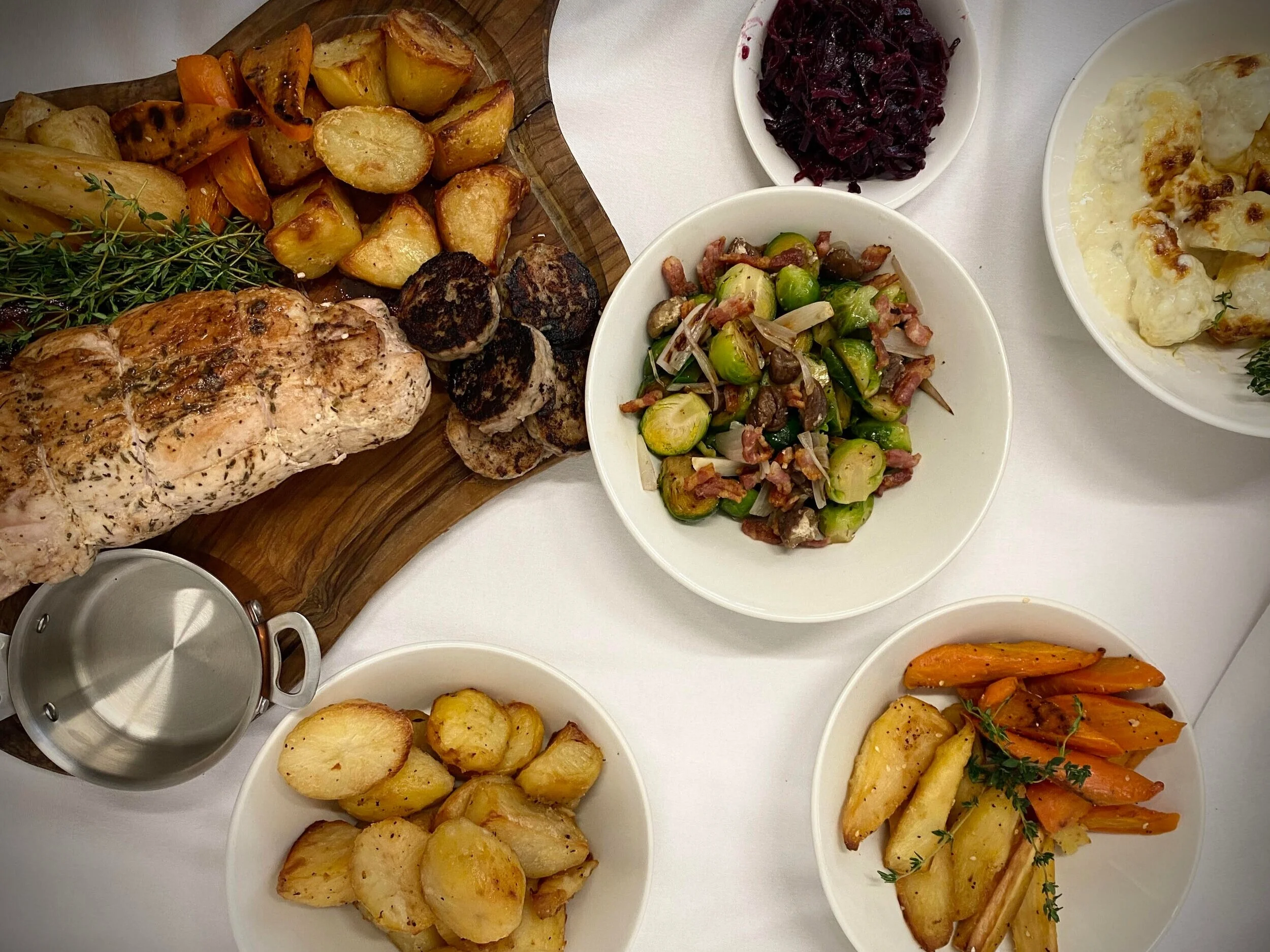 Chipolata sausage – sausage meat stuffing, lemon, chestnuts, thyme, lemon zest - Yorkshire pudding - duck fat roast potatoes - honey and sesame glazed carrot @ parsnip - spiced red cabbage - saute sprouts, bacon, shallots & chestnuts – natural gravy