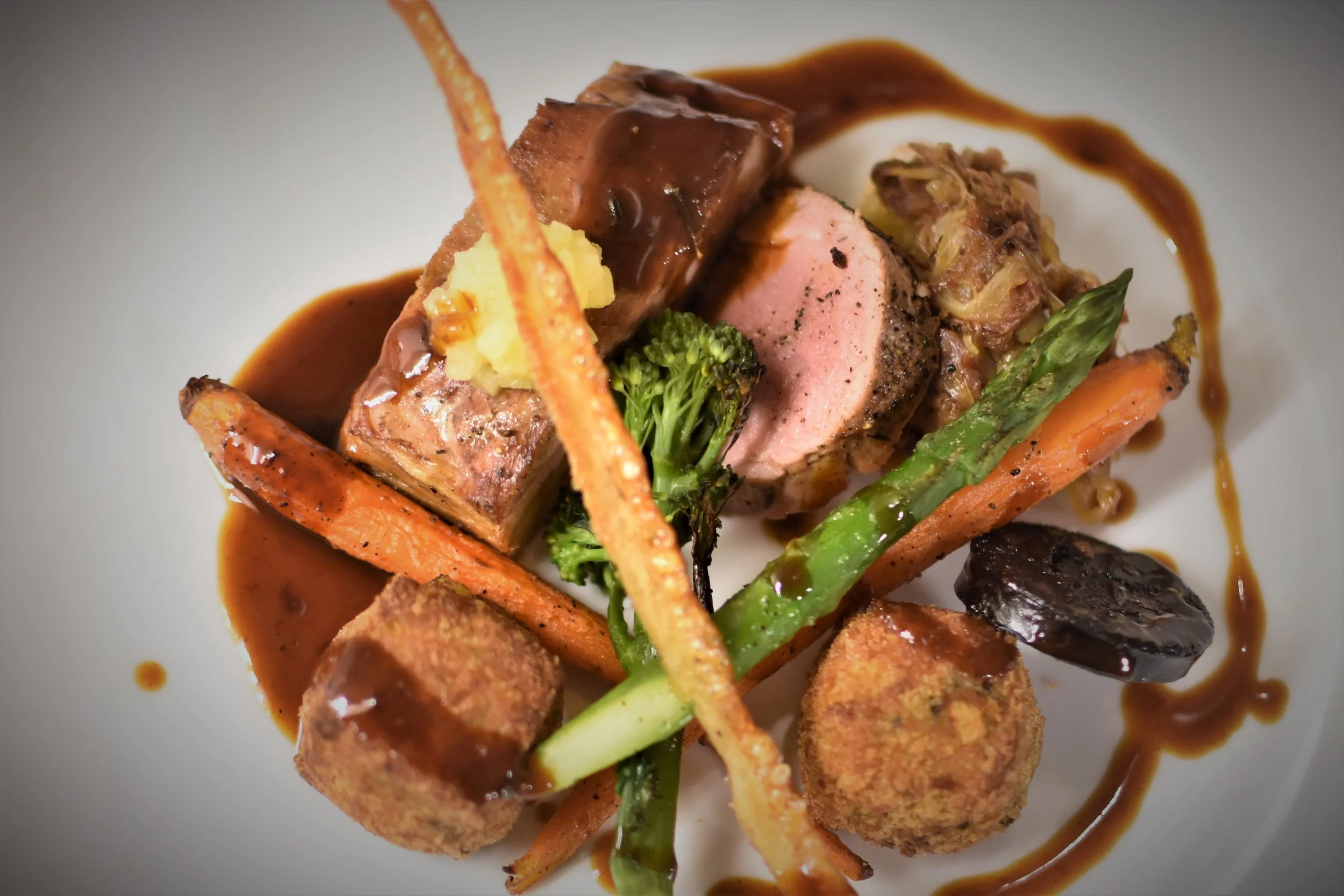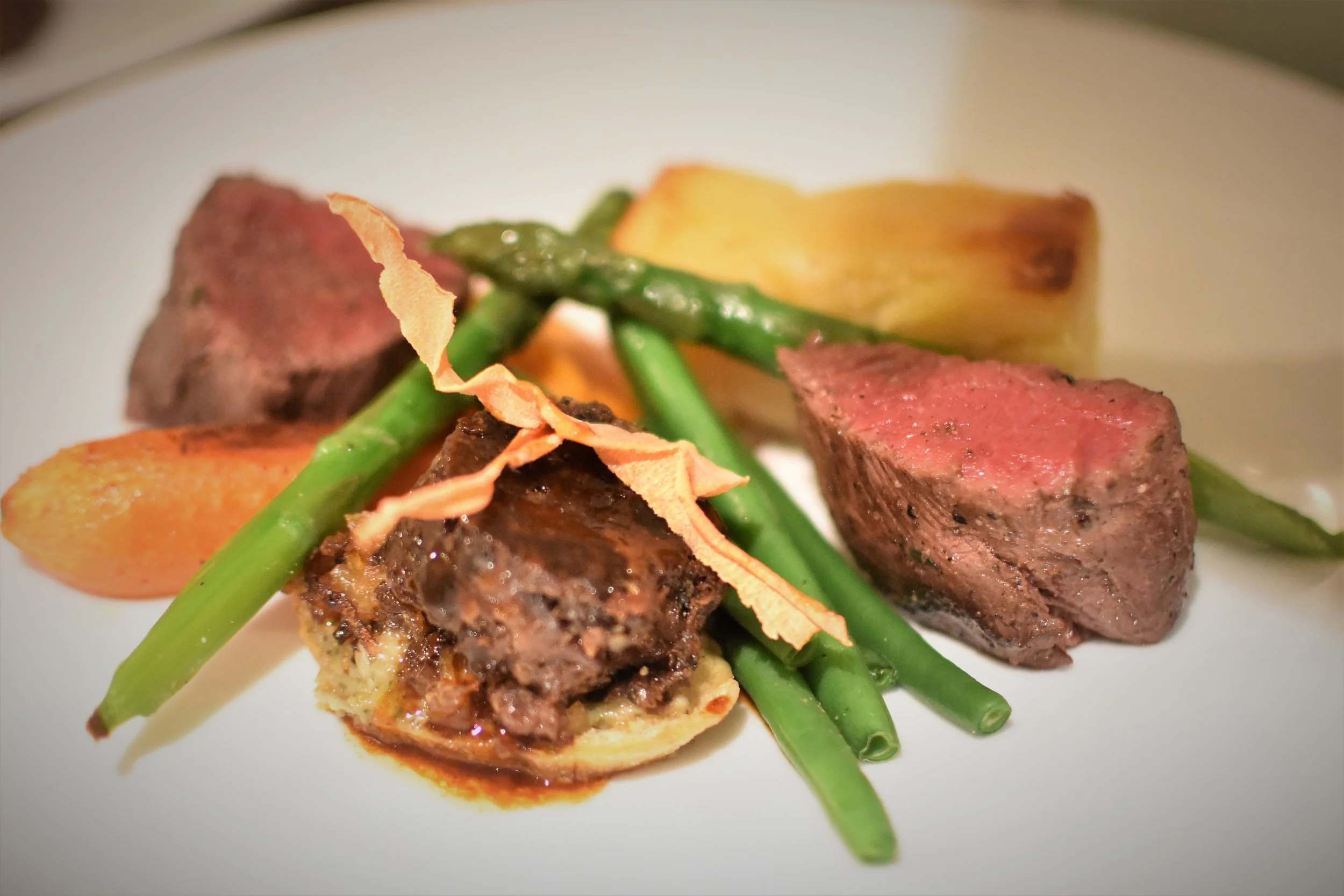 Pan roasted pave of centre cut of sirloin - slow cooked brisket croquette - black garlic - truffled potato gratin - greens - spiced roasted carrot - caramelised onion - red wine gravy